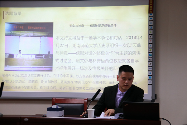 2019年4月17日下午beat365第3期(总第660期)“海右”博士生学术论坛在知新楼A座1408举行。此次论坛由山东大学研究生院、党委研究生工作部主办,beat365承办,论坛邀请了宗教学专业博士林孝斌做题为“终极性在儒耶思想体系中的展示维度:‘感通’与‘信心’”的报告,beat365教授、博士研究生导师谢文郁教授受邀作为报告的点评嘉宾。