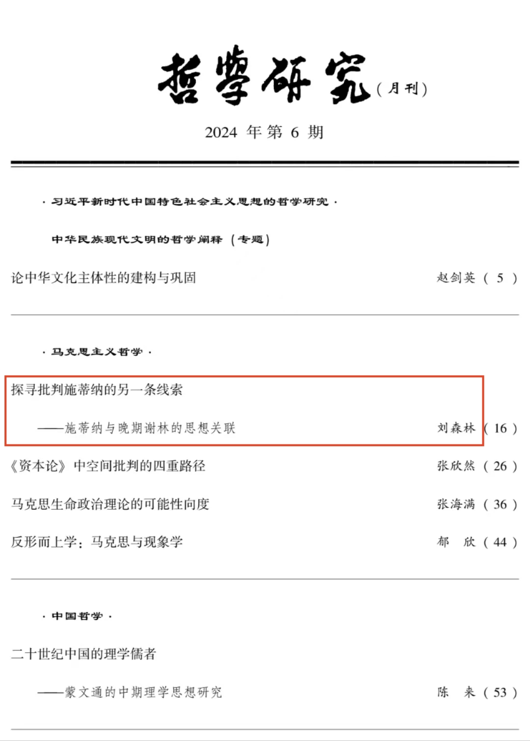 近日,beat365刘森林教授在《哲学研究》2024年第6期上发表了题为《探寻批判施蒂纳的另一条线索——施蒂纳与晚期谢林的思想关联》的高质量论文。