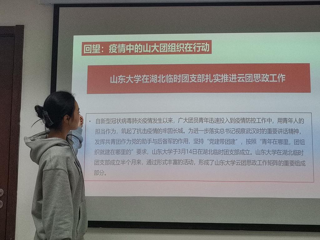 班会结束后,团支书屈雅楠主持团会。在会上,她声情并茂地讲解着共青团组织在抗疫过程中发挥的巨大作用,并回望了山东大学团组织的积极行动,同学们认真聆听,加深着对团组织的了解。